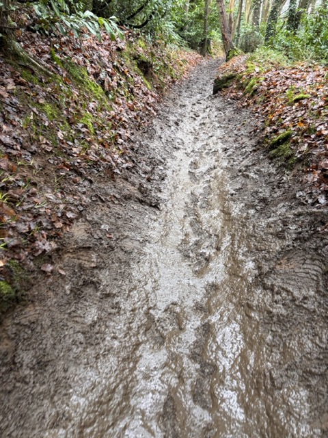 Quelques secondes d’arrêt avant de remonter dans la campagne jusqu’à Pordic. On emprunte les chemins VTT chers à mon enfance que j’ai pris de nombreuses fois avec mon père. Jusqu’au kilomètre 29, c’est globalement sec comme je le présentais. Mais la vallée de Pordic qui nous ramène ensuite sur le GR34 est une véritable patinoire et impose beaucoup plus de précautions.