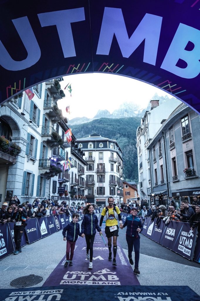 Dernier kilomètre et retour sur le bitume. Autant pour le départ, il y a plus d’ambiance à la Diagonale des Fous qu’à l’UTMB, autant pour l’arrivée c’est l’inverse. Un dernier kilomètre magique avec des encouragements, des cris, des applaudissements… J’ai des jambes de feu (pour un mec qui a fait 173km) et je finis les derniers kilomètres à près de 9km/h. J’ai déjà les larmes aux yeux quand j’arrive le long de l’Arveyron et cela ne s’arrange pas quand je récupère les 3 enfants à 200m de la ligne d’arrivée. On passe ensemble sous l’arche en courant pour un moment qui restera gravé à vie… Ma femme est juste en face à nous attendre et nous prendre en photo !