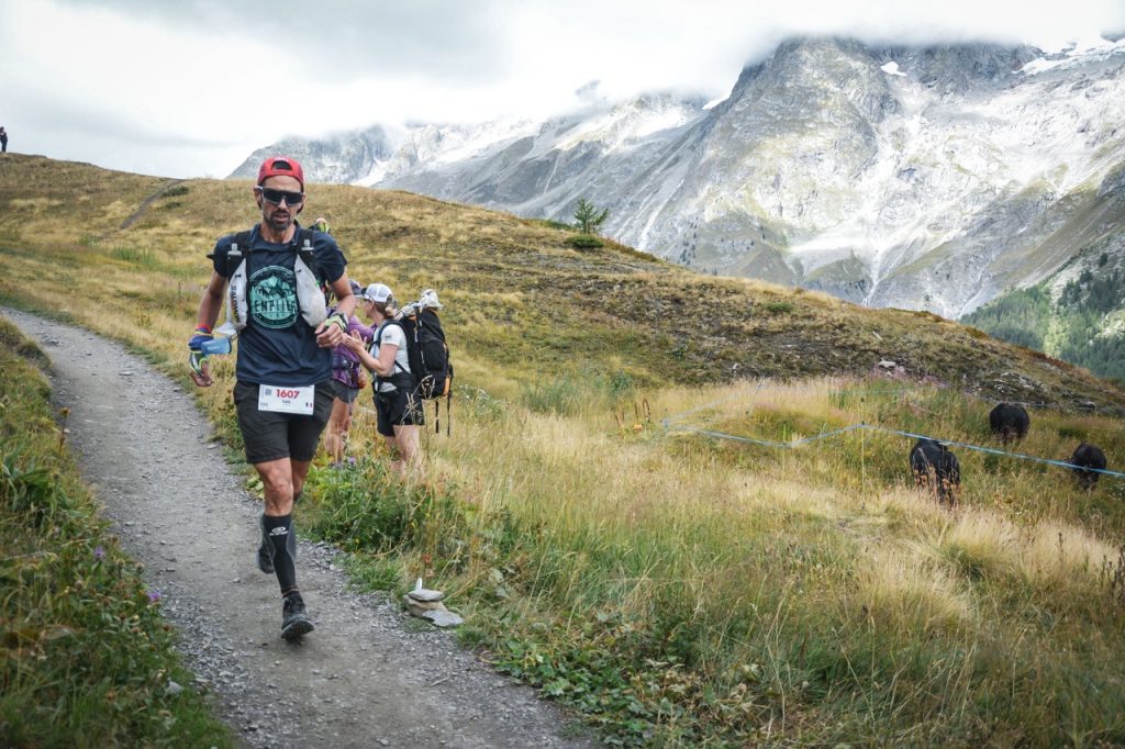 Je passe une heure au ravitaillement de Courmayeur. C’est plus long avec une assistance, mais bien plus sympa et tellement plus reposant. Je me change, recharge les batteries, m’hydrate (beaucoup à travailler de ce côté car j’aurai passé toute la course en sous-hydratation, même en me forçant) et me nourris. Ma femme a eu le temps d’acheter du Coca-Cola (car je ne suis pas un grand fan du cola UTMB et une nouvelle couverture de survie). Merci.