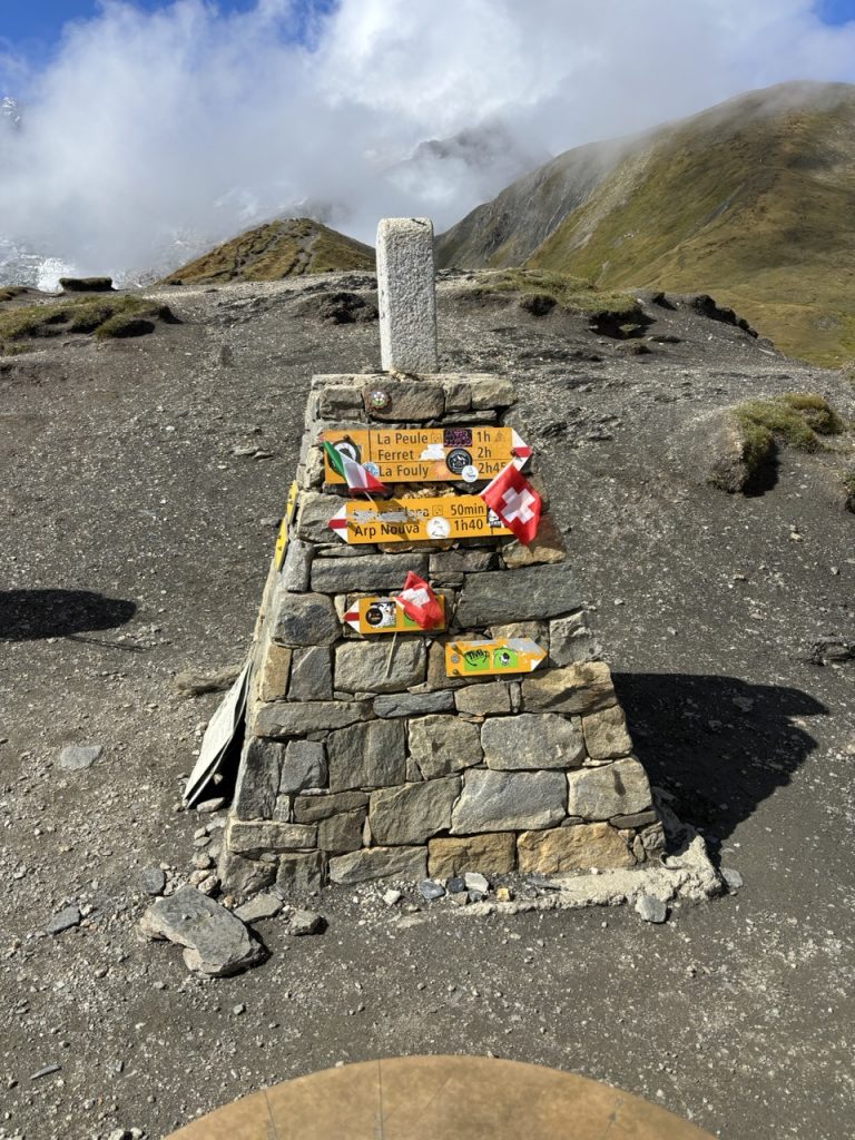 Arrivé au sommet du Grand Col Ferret (point culminant de la course à 2500m d’altitude), il n’est pas question de s’y attarder car même si le paysage est superbe, il y a beaucoup de vent. Je m’attaque alors à la descente vers La Fouly (avec 1400m de dénivelé négatif à faire avaler aux quadris).